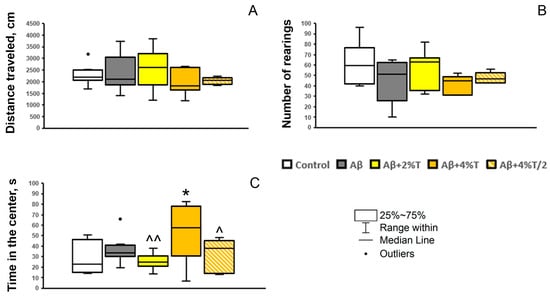 The effect of treatment with trehalose (2% or 4% solution daily (“Aβ + 2% T” or “Aβ + 4% T”) or 4% solution every other day (“Aβ + 4% T/2”), 14 days) on the behavior in the open field test in mice with Aβ-induced AD-like pathology. To set up the AD model, mice were given bilateral i.c.v. injections of Aβ25–35. The control group received vehicle (sterile water) i.c.v. injections. The treatment with trehalose was started 2 days after the i.c.v. Aβ25–35 administration. (A) distance traveled (cm), an index of locomotor activity; (B) a number of rearing bouts, an index of vertical locomotor activity and exploratory activity; (C) time spent in the center (s), an index of anxiety. The data are expressed as the median and interquartile range (Q1; Q3) of the values obtained in an independent group of animals (n = 6 to 9 per group). Statistically significant differences: * p < 0.05 vs. control group; ^ p < 0.05, ^^ p < 0.01 vs. “Aβ + 4% T” group.