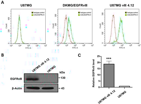 Evaluation of EGFRvIII expression in glioma cell lines. (A) EGFRvIII expression in the EGFRvIII-engineered U87MG cell lines (DKMG/EGFRvIII and U87MG vIII 4.12) and U87MG cells was analyzed by flow cytometry using a monoclonal antibody (mAb) against EGFRvIII. (B) The Western blot analysis of the EGFRvIII level in the U87MG vIII 4.12 and U87MG cells. β-Actin was used as an endogenous control. (C) The relative intensities of the EGFRvIII proteins were calculated by comparing them to the intensity of β-actin. The data are presented as the mean ± SD of three independent experiments. Statistical analysis was performed using a Student’s t-test. *** p < 0.001.