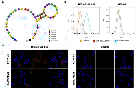 The binding of Cy5-EGFRvIII aptamer on the surface of the EGFRvIII-engineered U87MG cells was also examined using confocal microscopy. As shown in Figure 2C, the Cy5-EGFRvIII aptamer specifically colocalized at the membrane of U87MG vIII 4.12, whereas very little to no signal was observed on the U87MG cells. Cy5-ScrEGFRvIII did not bind to the U87MG vIII 4.12 and U87MG cells. Flow cytometry and confocal microscopy indicated that the EGFRvIII aptamer is highly specific for the EGFRvIII proteins.