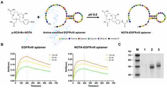 Characterization of the NOTA-EGFRvIII aptamer. (A) The schematic diagram of synthesis process for the preparation of the (1,4,7-triazanonane-1,4,7-triyl)triacetic acid (NOTA)-conjugated EGFRvIII (NOTA-EGFRvIII) aptamer. (B) The biolayer interferometry (BLI) data of the EGFRvIII aptamers and NOTA-EGFRvIII aptamers against various concentrations of EGFRvIII protein. (C) The evaluation of EGFRvIII aptamer conjugation with NOTA using urea/polyacrylamide gel electrophoresis. Lane M: 20/100 DNA ladder, Lane 1: empty vector, Lane 2: EGFRvIII aptamer, and Lane 3: NOTA-EGFRvIII aptamer.