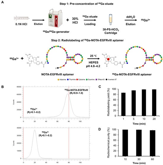 The 68Ga-labeled NOTA-EGFRvIII (68Ga-NOTA-EGFRvIII) aptamer was prepared using a preconcentration-based labeling method on an anion-exchange cartridge Chromafix 30-PS-HCO3 (Figure 4A) [20]. The 30-PS-HCO3 cartridge could trap 95.4 ± 1.5% of the activity from the 68Ge/68Ga-generator eluate. In addition, the recovery yield of 68Ga3+ from the 30-PS-HCO3 cartridge was 78 ± 4% (n = 10) with 0.3 mL of ddH2O.