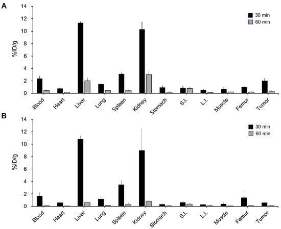 Ex vivo biodistribution of the 68Ga-NOTA-EGFRvIII aptamer in the mice bearing subcutaneous U87MG vIII 4.12 tumors. The uptake levels of the blood, heart, liver, lung, spleen, stomach, muscle, small intestine (S.I.), large intestine (L.I.), bone, and tumor at 30 min and 60 min after the tail vein injection of the 68Ga-NOTA-EGFRvIII aptamer in the mice bearing subcutaneous (A) EGFRvIII-positive U87MG vIII 4.12 tumors or (B) EGFRvIII-negative U87MG tumors. The whole biodistribution profiles are shown in the Supplementary Material. The data are expressed as a percentage of injected dose per gram tissue (%ID/g ± SD, n = 4 at each time point).