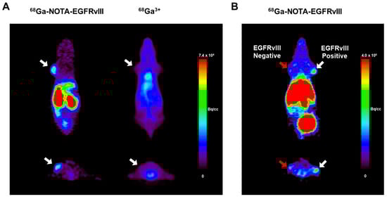 EGFRvIII is the most common point mutation in the extracellular domain of EGFR [23]. EGFRvIII is a promising target in cancer detection because of its strong expression in cancer cells but not in normal cells [24,25]. Despite this, few studies have reported the in vivo PET imaging of EGFRvIII using aptamer. This study tested the feasibility of a radioisotope-labeled EGFRvIII aptamer as an imaging agent for EGFRvIII-expressing tumors. The bifunctional chelator NOTA was conjugated to the EGFRvIII aptamer and labeled with 68Ga to visualize and evaluate the EGFRvIII expression in mouse tumor models. The ex vivo biodistribution studies revealed the highly selective targeting of the 68Ga-NOTA-EGFRvIII aptamer in the EGFRvIII positive U87MG vIII 4.12 tumor-bearing mice. Moreover, the in vivo PET images showed that the tumor uptake of the 68Ga-NOTA-EGFRvIII aptamer was significantly higher in the U87MG vIII 4.12 tumors than in the EGFRvIII negative U87MG tumors.