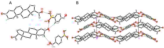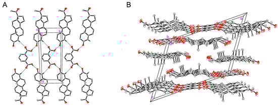 The expected 1:1 molecular stoichiometry of PROG–BBA was determined from its crystal structure (Figure 1A). The crystal belongs to the orthorhombic system and has a chiral space group of P212121. The structure of PROG and BBA is stabilized by abundant O–H···O hydrogen bonding and weak C–H···O interactions (Table 2), with O(5B)···O(1), C(22B)···O(1), O(4B)···O(2C), and C(2)···O(3A) distances of 2.801 (3), 3.456 (3), 2.802 (3), and 3.417 (4) Å, respectively. The connection mode involved the closed cavity of the ring motif. PROG and the adjacent BBA are linked by weak C(2)···O(3A) interactions (Figure 1A). The layers extend along the (100) plane (Figure 1B), with an inter-distance of approximately 4.5 Å.