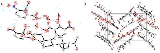 The PROG–NPA crystal exhibited an orthorhombic crystal system with the chiral space group P212121. The asymmetric unit of the PROG–NPA crystal comprised equal amounts of PROG, NPA, and water (Figure 3). The existence of water molecules in PROG–NPA caused the formation of a network that is significantly different from that in PROG–IPA or NPA alone [28]. In PROG–IPA, water molecules did not participate in any interactions, whereas in PROG–NPA, they played a significant role in network formation. Specifically, two water molecules linked the adjacent NPA molecules via O–H···O hydrogen bonds in the ring motif. The enclosed ring further linked another NPA molecule through O–H···O hydrogen bonds, with the O(8)···O(1W) distance of 2.851 (1) Å. The NPA molecule bound to the adjacent PROG molecule through O–H···O hydrogen bonds, with the O(7)···O(1) distance of 2.591 (3) Å, to form the three-dimensional structure of PROG–NPA (Figure 3B).