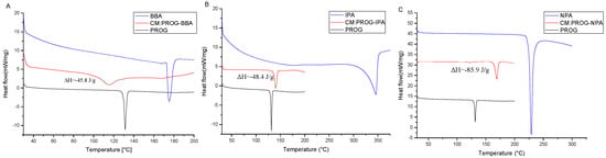 Combined DSC plots of (A) BBA, PROG–BBA, PROG; (B) IPA, PROG–IPA, PROG; and (C) NPA, PROG–NPA, PROG.