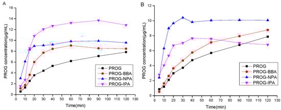 Cocrystal formation improved the solubility and dissolution rate of PROG. As shown in Figure 5A, in water medium at 37 ± 0.5 °C, PROG–IPA, PROG–BBA, and PROG–NPA reached Cmax of 13.68, 9.06, and 9.90 μg/mL, respectively, which were 1.7, 1.2, and 1.3 times that of PROG (7.84 μg/mL). Moreover, the cocrystals exhibited 2–4 times faster dissolution rates than PROG during the first 30 min. Among the cocrystals, PROG–IPA exhibited the highest Cmax and the fastest dissolution rate. However, the difference was reduced in pH 1.2 aqueous solution at 37 ± 0.5 °C. The solubility and dissolution rate of PROG–NPA obviously improved, whereas those of PROG–IPA increased in the first 40 min and then declined slowly. PROG–BBA showed a similar trend to that of PROG, and a slight improvement was observed. Among the cocrystals, only PROG–IPA exhibited an obvious reduction in solubility with decreasing pH indicating that H+ disrupted the hydrogen bond interaction between PROG and IPA and thus decreased in the solubility of PROG.