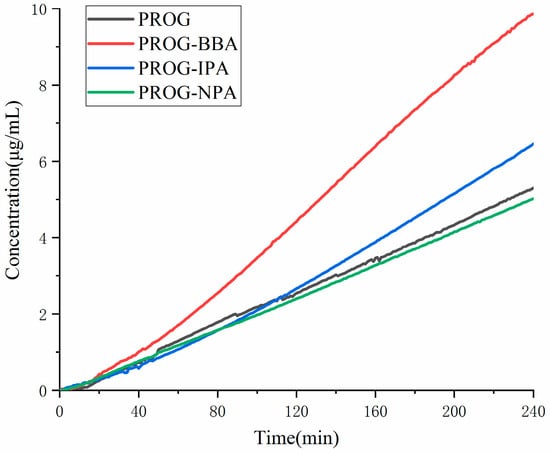 The permeation rate and effective permeability of the PROG monomer and cocrystals were investigated using μFlux in PBS (Figure 6). The drug was gradually transferred from the donor chamber to the acceptor chamber through the PAMPA membrane. According to Equation (1), the Flux(J) values of PROG–IPA, PROG–BBA, and PROG–NPA were 0.36, 0.62, and 0.28 μg·min−1·cm−2, respectively, all of which were 1.1, 1.9, and 0.9 times higher than the 0.32 μg·min−1·cm−2 of PROG. Among the cocrystals, PROG–BBA showed the most marked increase.