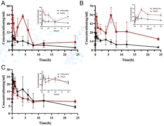 Mean plasma concentration versus time curves of PROG after oral administration of free PROG (black circles) and its cocrystals (red squares, (A): PROG–BBA, (B): PROG–IPA, (C): PROG–NPA) in SD rats. Each point represents the mean ± SD (n = 4).