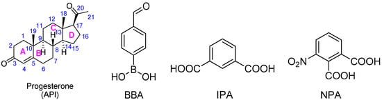 PROG is an ideal API for cocrystals because its structure contains a steroid backbone and terminal carbonyl groups, which provide the possibility of forming a complex intermolecular network [16]. Several PROG cocrystals, including alcohols, phenols, aromatic carboxylic acids, and theophylline, have been reported in recent years [17,18]. However, most studies have focused on intermolecular forces, and in vivo or in vitro behaviors have rarely been reported. In our previous work, we selected 2-chloro-4-nitroaniline (CNA), 2,5-dihydroxybenzoic acid, and 4,4′-phenol as CCFs to form cocrystals with PROG [19]. Compared with free PROG, all cocrystals, especially PROG–CNA, showed better solubility and dissolution rate. Building on these findings, we expand the scope of CCFs to include small-molecule acids, which may offer additional advantages in terms of forming stable cocrystals with improved pharmaceutical properties.