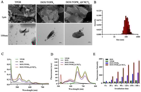 Characterization of DOX/TPOR4@CB[7]), (A) TEM and SEM images of TPOR, DOX/TPOR4 and DOX/TPOR4@CB[7]4; (B) the particle size distribution of DOX/TPOR4@CB[7]4; (C) images of the UV absorption spectrum and (D) fluorescence emission spectrum. (E) The fluorescence intensity changes of SOSG under 525 nm laser (95.5 mW/cm2) irradiation for different times (0 s, 30 s, 60 s, 90 s, 120 s, 150 s, 180 s) of DOX, TPOR, DOX/TPOR4, and DOX/ TPOR4@CB[7]4 (the drug concentration was 10 μM).