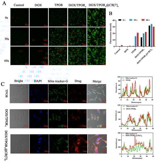 The subcellular localization of DOX/TPOR4@CB[7]4 in SH-SY5Y cells was assessed by co-incubating DAPI as a nuclear stain and MitoTracker green as a mitochondrial marker for colocalization experiments. The emission fluorescence at 600–750 nm, corresponding to the inherent fluorescence properties of TPOR, was utilized to determine its cellular distribution. As shown in Figure 2C, TPOR, DOX/TPOR4, and DOX/TPOR4@CB[7]4 all exhibited predominantly cytoplasmic red fluorescence. The fluorescence intensity of DOX/TPOR4 was higher than that of TPOR due to the combination resulting in superimposed signals. Furthermore, the fluorescence intensity of DOX/TPOR4@CB[7]4 was significantly enhanced compared to that of DOX/TPOR4 and it displayed strong accumulation within SH-SY5Y cells. These findings suggest that DOX/TPOR4@CB[7]4, possessing suitable size and biocompatibility characteristics, efficiently entered the cells owing to TPOR’s specific affinity [,]. This indicates that under similar conditions, the addition of CB[7] improved the solubility of DOX/TPOR4 and facilitated drug uptake by SH-SY5Y cells. Moreover, from the Figure 2C, it can be observed that red fluorescence emitted by DOX/TPOR4@CB[7]4 showed good colocalization with MitoTracker green dye indicating a similar distribution pattern between drug molecules and mitochondria suggesting potential drug action on mitochondria. Under excitation by a 520 nm laser, DOX/TPOR4@CB[7]4 emits bright fluorescence in the range of 600–750 nm, which falls within the near-infrared region. This property facilitates tissue and cell penetration as well as easy observation within cells. The increased fluorescence emission in the combination group aids in visualizing tumor diagnosis and treatment.