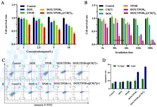 DOX, TPOR, DOX/TPOR4, DOX/TPOR4@CB[7]4 was added into different concentrations (1, 2.5, 5, 10 μM), respectively, for 24 h, and washed with PBS three times. Then, the fresh DMEM medium was replaced and incubated for 24 h. An MTT assay was used to determine the cell viability rate with an ultramicroporous plate spectrophotometer (Epoch2, Biotek, Santa Clara, CA, USA).