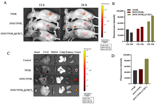 The in vivo tumor-targeting ability of DOX/TPOR4@CB[7]4 was evaluated by fluorescent imaging on an IVIS Spectrum system (PerkinElmer, Waltham, MA, USA). Briefly, 2.5 μM DOX and 10 μM TPOR DOX/TPOR4 and DOX/TPOR4@CB[7]4 were intravenously injected into the tumor bearing mice and the fluorescent images of mice at intervals of 0 h, 12 h, 24 h, 36 h, and 48 h were observed and recorded.
