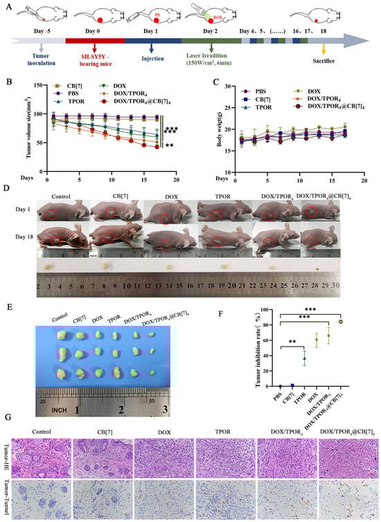 Furthermore, the efficacy of in vivo Chemo/PDT combination therapy was assessed by monitoring changes in tumor volumes and final tumor weight 18 days after different treatments (Figure 5A). After treatment, the DOX/TPOR4 group demonstrated superior anti-cancer efficiency compared to the DOX and TPOR groups. The DOX/TPOR4@CB[7]4 group exhibited a significantly greater reduction in tumor volume (Figure 5B), along with enhanced tumor inhibition (84.17%) compared to TPOR (36.69%) and DOX/TPOR4 (65.95%) groups (p < 0.001) (Figure 5E,F). Throughout the 18-day period, all groups maintained stable body weights without any observed skin damage on their surface skin during treatment on mice surface skin (Figure 5D).