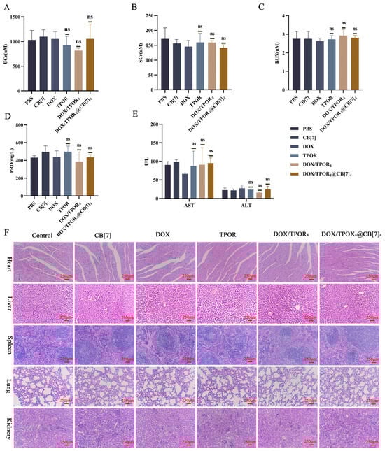 Biosafety analysis of different treatments. Content analysis of Serum renal function indicators Scr (B), BUN (C), urine Ucr (A), and PRO (D). (F) Content analysis of serum liver function indexes ALT, AST (E). Pathological analysis of major organs in different treatment groups after 18 days (F). Pathological analysis of major organs in different treatment groups after 18 days (F). (ns p > 0.05).