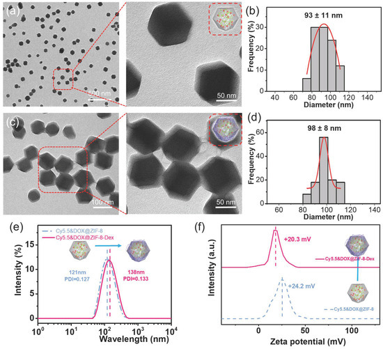 TEM images of: (a) Cy5.5&DOX@ZIF-8 composite NPs (c) and dextran-modified Cy5.5&DOX@ZIF-8-Dex composite NPs. Size distributions of: (b) Cy5.5&DOX@ZIF-8 composite NPs and (d) dextran-modified Cy5.5&DOX@ZIF-8-Dex composite NPs. (e) DLS curves of Cy5.5&DOX@ZIF-8 and dextran-modified Cy5.5&DOX@ZIF-8-Dex NPs. (f) Zeta potentials of Cy5.5&DOX@ZIF-8 and dextran-modified Cy5.5&DOX@ZIF-8-Dex NPs.