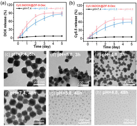 (a) DOX release from Cy5.5&DOX@ZIF-8-Dex at different pH values. (b) Cy5.5 release from Cy5.5&DOX@ZIF-8-Dex at various pH values. TEM images of Cy5.5&DOX@ZIF-8-Dex under different pH values for 3 h: (c) pH = 7.4, (d) pH = 5.8, and (e) pH = 4.8. TEM images of Cy5.5&DOX@ZIF-8-Dex under different pH values for 48 h: (f) pH = 7.4, (g) pH = 5.8, and (h) pH = 4.8.