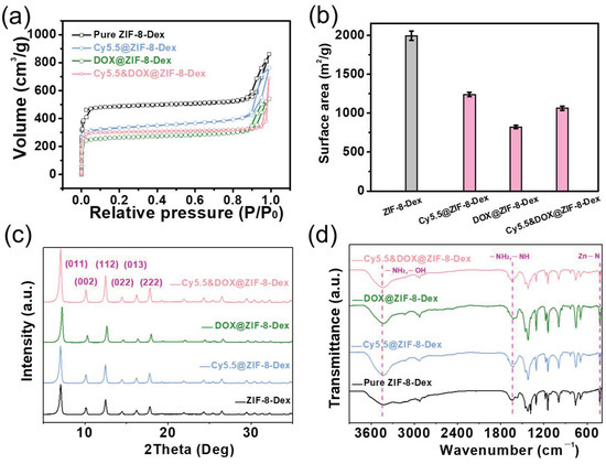 After the encapsulation and release of functional molecules were systematically investigated, the structural properties of Cy5.5&DOX@ZIF-8-Dex, including porosity and crystallinity, were subsequently characterized to explore their influence on the drug-loading capabilities of the ZIF-8-Dex NPs. Initially, the N2 adsorption–desorption curves of pure ZIF-8-Dex, Cy5.5@ZIF-8-Dex, DOX@ZIF-8-Dex, and Cy5.5&DOX@ZIF-8-Dex NPs at 77 K (Figure 3a) followed the type I isotherm [46,47]. The Brunauer–Emmett–Teller (BET) surface areas of the various ZIF-8-Dex systems revealed that the pure ZIF-8-Dex NPs possessed the highest surface area, and the surface areas decreased due to the encapsulation of functional molecules (Figure 3b). This trend suggested that the ZIF-8 content in the composite NPs had a direct influence on their porosities and surface areas. In other words, the encapsulation of functional molecules led to a reduction in the ZIF-8 content within the composite NPs, thus causing the effective surface area to decrease. The XRD patterns (Figure 3c) of all the composite NPs closely matched that of pure ZIF-8, which suggested that they had identical crystal structures in each case. In particular, all of the composite NPs exhibited similar characteristic peaks to those of pure ZIF-8 at angles of 7.2°, 10.4°, 12.8°, 14.5°, 16.3°, and 18.7°, which, respectively, corresponded to (011), (002), (112), (022), (013), and (222) crystal planes [30,48]. Moreover, the FTIR spectra of the various composite ZIF-8-Dex NPs were also very similar (Figure 3d), which provided further evidence that they possessed the same ZIF-8 structure regardless of whether they had encapsulated functional molecules. The characteristic peak at ~425 cm−1 was ascribed to the stretching vibrations of Zn-n, obviously demonstrating the formation of a ZIF-8 structure [14,17]. Moreover, the wide peak from 3300 to 3700 cm−1 was attributed to the stretching vibrations from dextran (O-H, -NH2) and ZIF-8 (-NH). As shown in Figure S10, the peak at 1550–1650 cm−1 from Cy5.5&DOX@ZIF-8 NPs was owing to the secondary amino group (-NH) from the 2-mim in ZIF-8 structure, while the appearance of a relatively stronger peak from Cy5.5&DOX@ZIF-8-Dex NPs in the same region resulted from the primary amino group (-NH2) from dextran, which further proves the surface decoration of dextran on these composite NPs. All of these results confirmed the integrity of the ZIF-8 structure in Cy5.5&DOX@ZIF-8-Dex NPs, which was the foundation for the porosity and pH sensitivity of these materials and thus laid the groundwork for high drug-loading and pH-responsive drug-release capabilities.