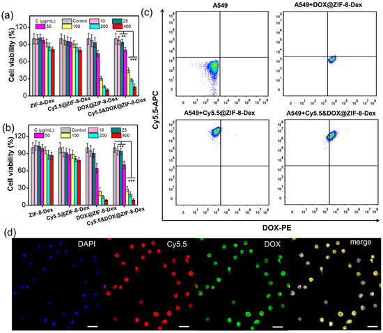 Regarding the considerable loading of DOX within the ZIF-8 structure, we further explored the feasibility of the as-prepared composite NPs as drug delivery systems for anticancer therapy. The cytotoxicities of Cy5.5&DOX@ZIF-8-Dex toward human umbilical vein endothelial cells (HUVEC) and human non-small-cell lung carcinoma cells (A549) were thus studied with the use of CCK-8 assays. As depicted in Figure 4a,b and Figure S11, it was found that the pure ZIF-8 and Cy5.5@ZIF-8-Dex NPs were negligibly toxic toward the HUVEC and A549 cells within the studied concentration range, thus implying the low cytotoxicity of the composite NPs in the absence of an anticancer drug. In contrast, the DOX@ZIF-8-Dex and Cy5.5&DOX@ZIF-8-Dex samples demonstrated concentration-dependent therapeutic effects on HUVEC and A549 cells due to the encapsulation of DOX within these composite NPs. In particular, the cell viabilities observed in the Cy5.5&DOX@ZIF-8-Dex treatment group were approximately 15.8% for 24 h and 9.1% for 48 h at the concentration of 400 μg/mL, respectively, indicating significant differences in comparison with control group (n = 6, p < 0.001).