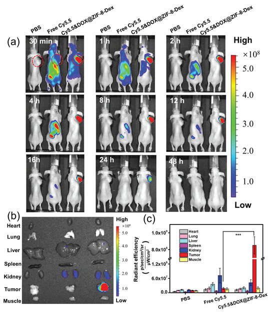 (a) In vivo fluorescent images of free Cy5.5 and Cy5.5&DOX@ZIF-8-Dex NPs in A549 tumor-bearing nude mice. The tumors are shown in red circles at the anterior armpits. (b) In vivo fluorescent images of organs harvested from A549 tumor-bearing nude mice that were, respectively, injected with PBS, free Cy5.5, and Cy5.5&DOX@ZIF-8-Dex NPs. (c) Fluorescence intensities observed in the organs shown in (b) (n = 6, *** p < 0.001).