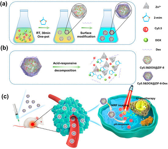 ZIF-8 particles can be fabricated by various strategies, such as solvothermal, microwave, sonochemical, mechanochemical, dry-gel conversion, microfluidic, and electrochemical methods [23,24,25]. Among them, the solvothermal method is the most widely adopted approach to obtain ZIF-8 NPs and their composite NPs loaded with functional molecules in organic solvents or water [15,26]. Moreover, ZIF-8 NPs, serving as nanocarriers encapsulating functional molecules, are usually prepared via two-step or one-pot approaches [17,26,27]. Specifically, the former approach separates the construction of the ZIF-8 structure and the encapsulation of functional molecules as two distinct processes, whereas the latter strategy integrates the two processes synchronously, resulting in more abundant encapsulation of functional molecules [17,26]. During synthesis via the one-pot method, the immobilization of functional molecules is achieved in either aqueous or organic solvents, depending on the solubility of the molecules [28,29,30,31,32]. Namely, the encapsulation of hydrophilic molecules greatly dissolved in water is normally conducted in aqueous solution [29,30], while the loading of hydrophobic molecules that are poorly dispersed in water is performed in organic solvents [31,32]. As reported, dimethyl sulfoxide/water (DMSO/H2O) mixed solvents can be used to simultaneously immobilize hydrophilic photo-thermal molecules and hydrophobic imaging agents into ZIF-8 NPs for tumor photothermal therapy and fluorescence imaging [33,34]. However, there is still few specific studies that allow for the sufficient co-encapsulation of chemotherapeutic drugs and imaging agents with varying hydrophilicity, resulting in the construction of multifunctional ZIF-8 composite NPs via the one-pot method for acid-responsive, near-infrared fluorescence imaging/chemotherapy combination theranostics.