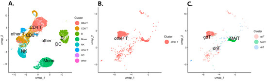 UMAP projections of annotated cell types. (A) All clusters; (B) other T cell cluster; (C) annotation of cells harboring in the other T cell cluster.