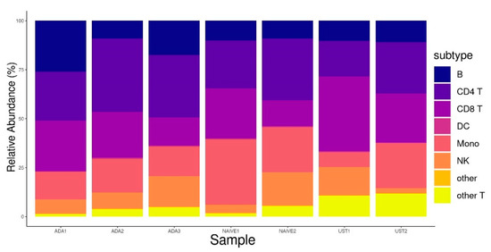 To uncover gene expression signals potentially masked due to the treatment and ongoing inflammation, we performed a three-stage scRNA-seq analysis. Obtained scRNA transcriptomes from five CD patients were integrated, resulting in 26,707 cells after quality control. First, the integrated data were annotated and mapped, yielding eight distinct PBMC sub-populations (Figure 1A). Further analysis revealed that the other T cell clusters harbored γδ T cells (gdT), double-negative T cells (dnT), and MAIT cells (Figure 1B,C). The resulting cell numbers were as follows: 3653 for B cells, 7300 for CD4+ T cells, 6098 for CD8+ T cells, 5158 for monocytes, 2903 for NK cells, and 1422 for other T cells. The other T cells cluster consisted of 971 gdT, 75 dnT, and 350 MAIT cells and 26 annotation remnants of T cells. The other T cell cluster was analyzed as one entity. No statistically significant differences in cell type fractions were observed among the ADA responders, ADA non-responders, and patients naïve with respect to biological therapy (Figure 2).