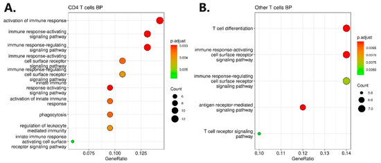 Gene ontology enriched biological processes terms for CD4 T cells and other T cells. (A) The enriched biological processes terms for CD4+ T cells; (B) the enriched biological processes terms for other T cells.