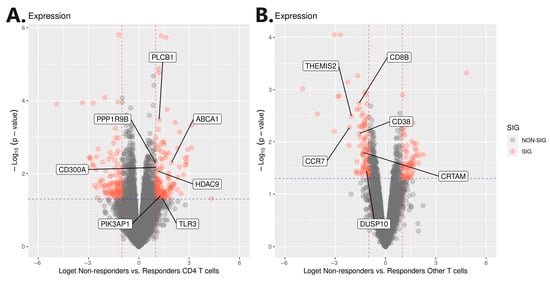 Volcano plots of differential gene expression with labeled genes from significant genomic regions. (A) Differential gene expression in CD4+ T cells; (B) differential gene expression in other T cells. Loget: log2FC.
