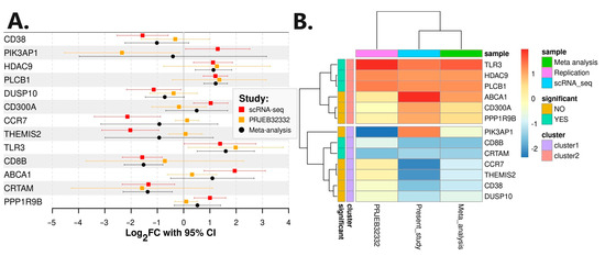 A replication of differential gene expression was carried out with an additional RNA-seq analysis using publicly available raw RNA sequencing .fastq files of FACS-sorted CD4+ T cells obtained from Belgian CD patients. The replication cohort consisted of fourteen responders to IFX and five non-responders to IFX (Bioproject: PRJEB32332). RNA-seq analysis revealed 277 differentially expressed genes (Table S4). Genes PIK3AP1 and TLR3 proved to be statistically differentially expressed also in the replication cohort. However, gene PIK3AP1 exhibited a different direction of perturbation in the replication study. All 13 genes of interest were also extracted from the results and included in the subsequent meta-analysis (Table 4). A meta-analysis of scRNA-seq and independent RNA-seq confirmed PLCB1, CD8B, TLR3, HDAC9, and CRTAM as statistically significant (p value < 0.05) genes in anti-TNFα non-response (Figure 5). PIK3AP1 was flagged as non-significant in the meta-analysis, as expected due to the different direction of expression.