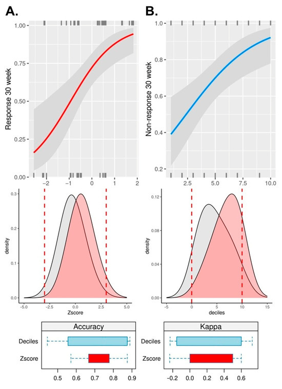 Oligogenic risk score: (A) normalized Z-scores; (B) decile-ranked; red density plot indicates density diagram for non-responders.