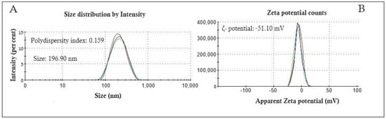 The particle size distribution and ζ-potential of APON are shown in Figure 1. Nanocapsules showed a particle size of 196.90 nm (Figure 1A). The particle size distribution graph exhibits a narrow peak base, typical of a system with a low polydispersity index (0.159). Nanocapsules showed a ζ-potential of −59.10 mV (Figure 1B), and a pH of 5.14.