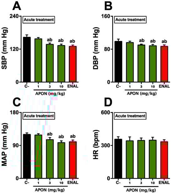 Acute antihypertensive effects of Attalea phalerata oil-loaded nanocapsules (APON). APON was administered intraduodenally in anesthetized rats. The systolic blood pressure (SBP; A), diastolic blood pressure (DBP; B), mean arterial pressure (MAP; C), and heart rate (HR; D) are displayed. C-, effect of vehicle control (0.9% saline, 200 μL). The results are expressed as mean ± SEM (n = 6/group). a p < 0.05 when compared with respective control group; b p < 0.05 when compared with 1 mg/kg APON (ANOVA followed by Bonferroni post hoc test).
