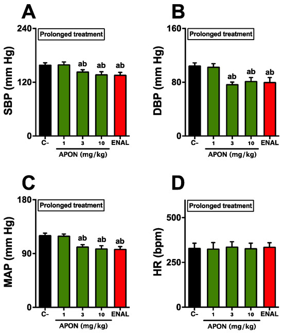 Sustained antihypertensive effects of Attalea phalerata oil-loaded nanocapsules (APON). APON was administered orally daily for 7 days. The systolic blood pressure (SBP; A), diastolic blood pressure (DBP; B), mean arterial pressure (MAP; C), and heart rate (HR; D) are displayed. C-, effect of vehicle (filtered water, 300 μL). The results are expressed as mean ± SEM (n = 6/group). a p < 0.05 when compared with respective control group; b p < 0.05 when compared with 1 mg/kg APON (ANOVA followed by Bonferroni post hoc test).