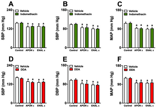 Absence of the involvement of the prostaglandin/cAMP pathway in the antihypertensive effect of Attalea phalerata oil-loaded nanocapsules (APON). The animals received APON (3 mg/kg, intraduodenally) in the presence and absence of an intraperitoneal injection of indomethacin (3 mg/kg) or DDA (0.1 mg/kg). The systolic blood pressure (SBP; A,D), diastolic blood pressure (DBP; B,E), mean arterial pressure (MAP; C,F) are displayed. a p < 0.05 when compared with respective control group (ANOVA followed by Bonferroni post hoc test). DDA, 2′,5′-dideoxyadenosine.