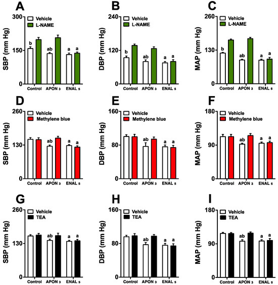 Involvement of the nitric oxide/cGMP pathway and K+ channels in the antihypertensive effect of Attalea phalerata oil-loaded nanocapsules (APON). The animals received APON (3 mg/kg, intraduodenally) in the presence and absence of a continuous infusion of L-NAME (7 mg/kg/min), a continuous infusion of methylene blue (150 nmol/kg/min), or an intraperitoneal injection of tetraethylammonium (400 μmol/kg). The systolic blood pressure (SBP; A,D,G), diastolic blood pressure (DBP; B,E,H), mean arterial pressure (MAP; C,F,I) are displayed. The results are expressed as mean ± SEM (n = 6/group). a p < 0.05 when compared with respective control group; b p < 0.05 when compared with respective inhibitor (ANOVA followed by Bonferroni post hoc test). L-NAME, Nω-Nitro-L-arginine methyl ester; TEA, tetraethylammonium.