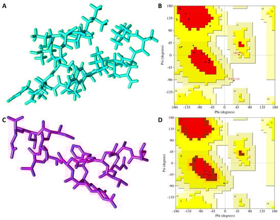 The 3-D structures of the most promising putative antimicrobial peptides were modelled de novo utilizing PEP-FOLD V3.5 at https://bioserv.rpbs.univ-paris-diderot.fr/services/PEP-FOLD3/ accessed on 2 January 2024 [34]. FASTA files were used as input for 100 default simulations. Output models were ranked based on sOPEP energies and Apollo-predicted melting temperature. To validate the predicted structure, we submitted the same FASTA file sequences to the Iterative Threading Assembly Refinement (I-TASSER) server (https://zhanglab.dcmb.med.umich.edu/I-TASSER/ accessed on 2 January 2024) [35]. The server uses protein templates identified using the Local Meta-Threading Server (LOMETS) from the Protein Data Bank (PDB) library (https://www.rcsb.org/ accessed on 2 January 2024) to predict 3-D structures guided by their confidence score [36]. The quality of the modeled structures was then evaluated by estimating their stereochemical properties using a Ramachandran Plot Server (https://saves.mbi.ucla.edu/ accessed on 4 January 2024).