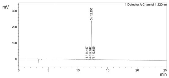 Chromatogram of the NACAP-II peptide in the 25 min run at 220 nm. Inertsil ODS-SP 4.6 mm × 250 mm reversed-phase high-performance liquid chromatography (RP-HPLC) column with the gradient from solvent A [0.065% Trifluoroacetic acid (TFA) in water] to solvent B (0.05% TFA in Acetonitrile) at a flow rate of 1.0 mL/min.
