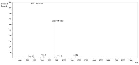 The synthesized peptides were detected at the wavelength of 220 nm to a purity of 97.4% (Figure 3). The mass spectrum (Figure 4) of the synthesized peptides indicated that their molecular mass was the same as that established during peptide sequencing (1730.1 Da). The synthesized peptide NACAP-II showed a 22.7 ± 0.9 mm zone of inhibition (Figure 5) and a 91.3 ± 1.2 μg/mL minimum inhibitory concentration against ESBL-producing E. coli.
