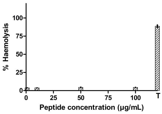 T-1% Triton X-100. Percentage of hemolysis of rabbit red blood cells via synthesized antimicrobial peptide. The concentration of (1–100) µg/mL did not hemolyze the rabbit blood cells. The experiment was performed in triplicate, and mean values were reported.