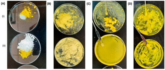 One natural β-cyclodextrin and a derivative with the hydrophilic hydroxypropyl substitutions were investigated to form host–guest complexes with RA. Two techniques— the physical mixing and kneading techniques—were employed to form the solid dispersions. Figure 2A–D shows pictorial outlines for the different steps of physical mixing and kneading to prepare the RA:CDs-dispersed mixtures for further study and characterization. It is worth mentioning that the RA:HP β-CD-kneaded mixtures were well dissolved and dispersed in the Petri dish using the same amount of kneading solution, as demonstrated in Figure 2(C-ii). This could be ascribed to the greater solubility and hydrophilicity of the HP-β-CD derivative used compared to the less soluble native β-CD.