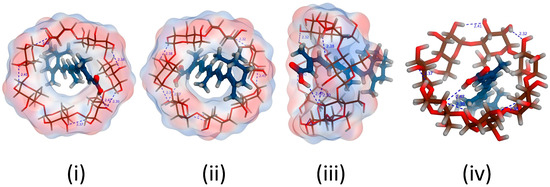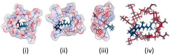 3D poses for Retinoic acid docked into the inclusion pocket of β-cyclodextrin showing (i) top view, (ii) bottom view (iii) side view (iv) top view with marked interactions demonstrating bond length.
