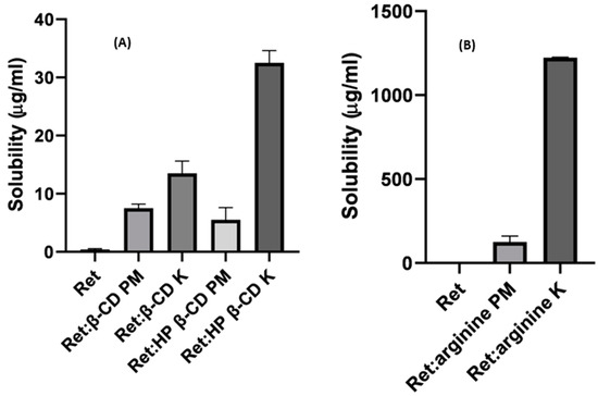 Solubility of retinoic (Ret) alone and Ret physical (PM) and kneading (K) mixtures with the two cyclodextrins (A) and arginine (B). Data represent means ± SD, n = 3.
