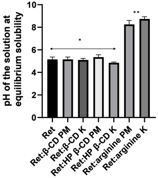 pH measurements of retinoic (Ret) alone and Ret physical (PM) and kneading (K) mixtures with the two cyclodextrins and arginine at equilibrium. Data represent means ± SD, n = 3. * Denotes non-significant differences p > 0.05 and ** denotes significant differences p < 0.05.