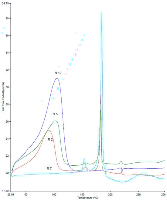 DSC thermograms for retinoic acid (Ret; R7), β-CD (R10), Ret:β-CD PM (R2), and Ret:β-CD K (R5).