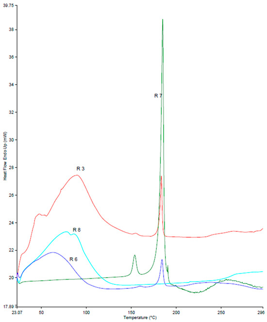 DSC thermograms for retinoic acid (Ret; R7), HP β-CD (R8), Ret:HP β-CD PM (R3), and Ret:HP β-CD K (R6).