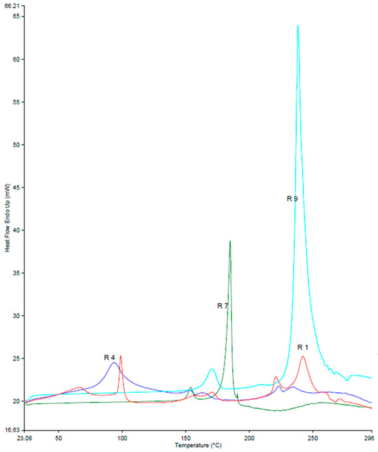 DSC thermograms for retinoic acid (Ret; R7), L-arginine (R9), Ret:arginine PM (R1), and Ret:arginine K (R4).
