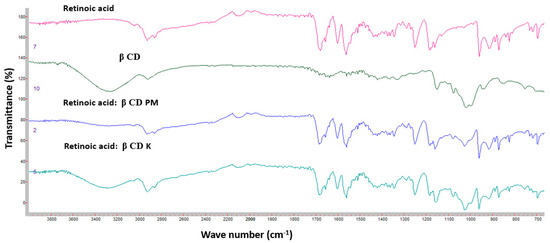 FTIR spectra of Ret, β-CD, Ret:β-CD PM, and Ret:β-CD K.