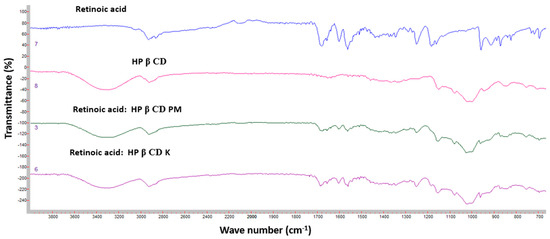 FTIR spectra of Ret, HP β-CD, Ret:HP β-CD PM, and Ret:HP β-CD K.
